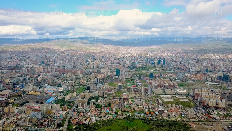 Монголия, Улан-Батор Панорама города с высоты птичьего полета в пасмурную погоду, с дрона