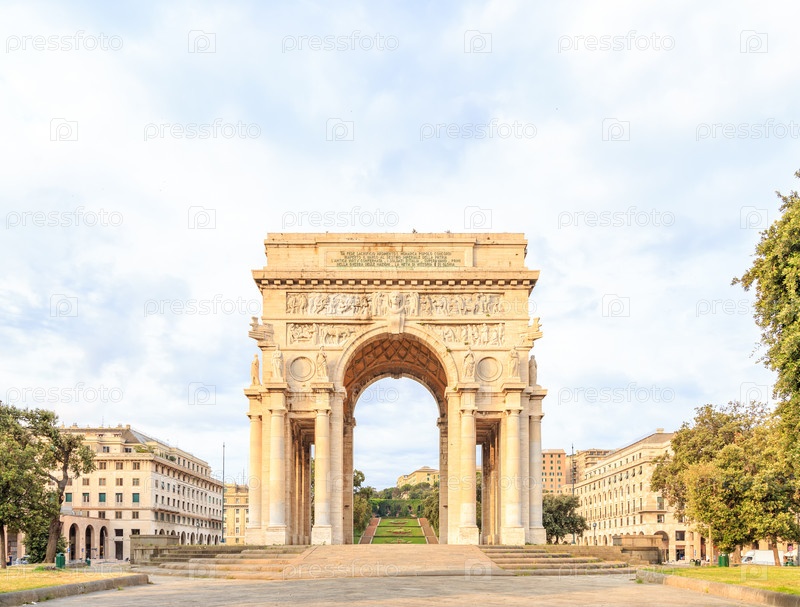 В Италии, Генуя. Арка Победы. Текст на английском языке: ГЕНУЯ. СИНОВИЯ, ПРОБЛЕЖНОСТЬ РОДОНЫ, ЗАГРАЗОВАТЕЛЬСТВА НА ЛЕСЕ И МОРЕ В ЦЕРКУ В Славе Веков. СПОРТА ОПИСАННАЯ. MCMXV-MCMXVIII