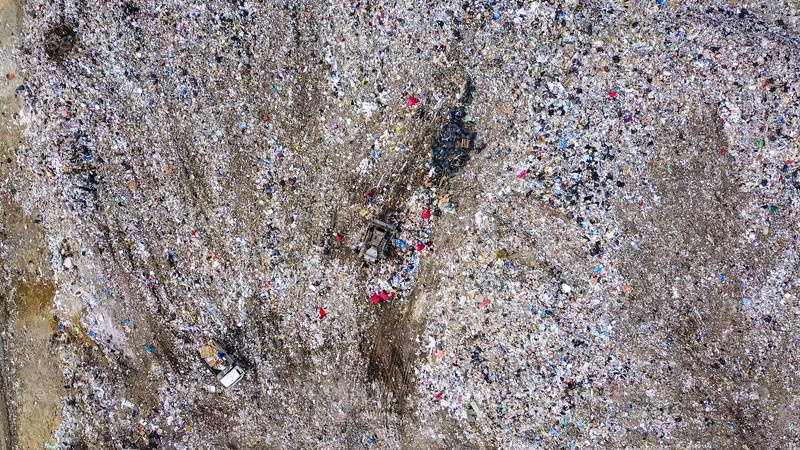 Трактор перевозит мусор на свалках в окрестностях города Екатеринбурга, Россия, с дрона, СНИМОК ГОЛОВЫ