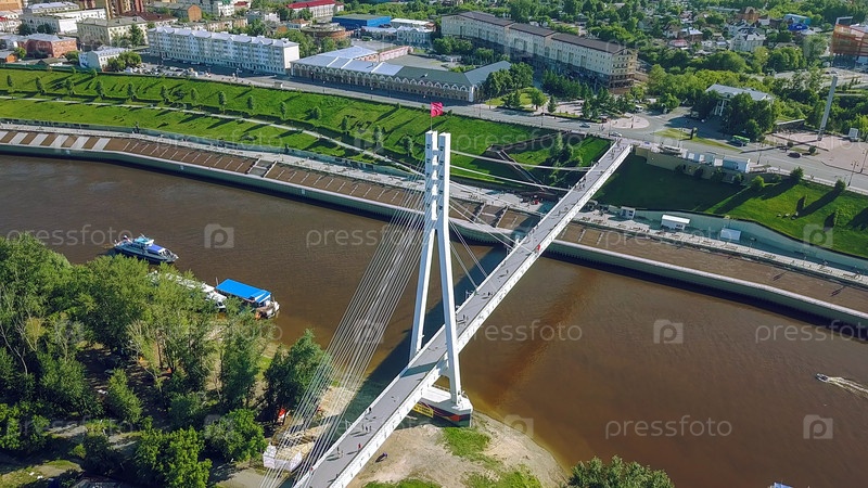 Город Тюмень, Набережная реки Туры, Мост Влюбленных. Россия, на русском тексте - ТЮМЕНЬ, От Дрон