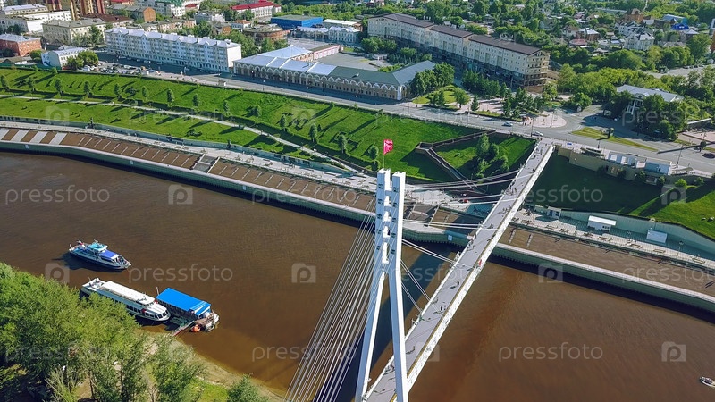 Город Тюмень, Набережная реки Туры, Мост Влюбленных. Россия, на русском тексте - ТЮМЕНЬ, От Дрон