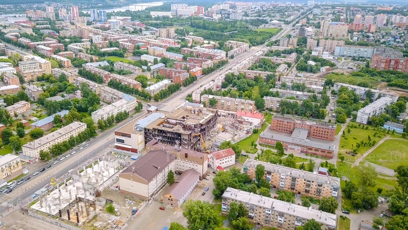 Вид на торговый центр после пожара. Кемерово, Россия, Из Дрона