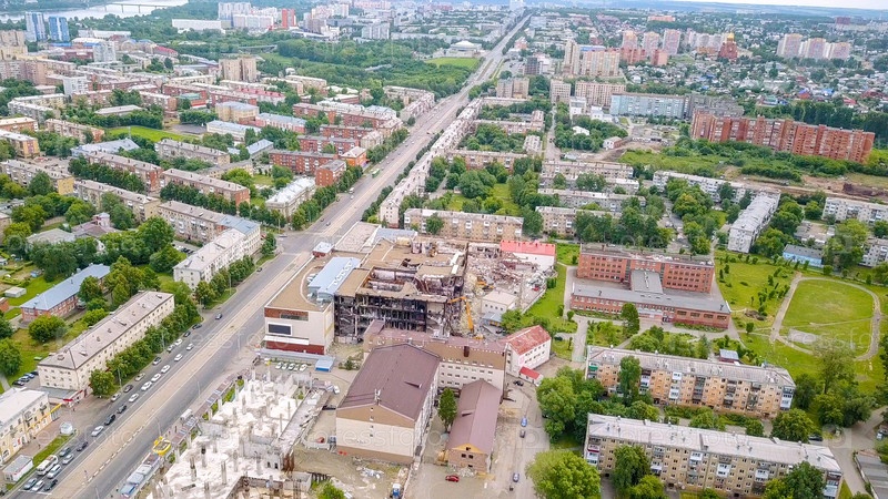 Вид на торговый центр после пожара. Кемерово, Россия, Из Дрона