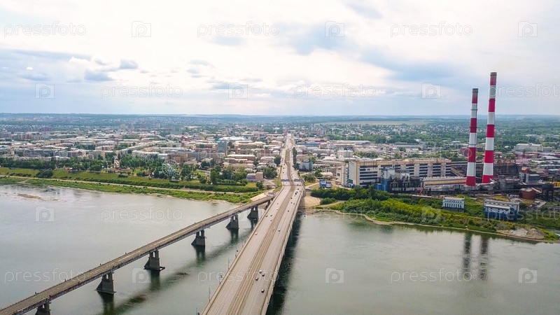 Кузнецкий мост через реку Томь. Панорамный вид на город Кемерово. Россия, Из Дрона