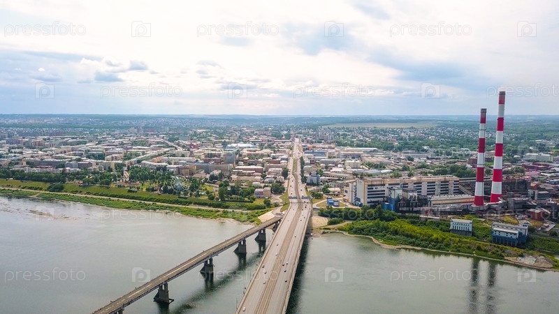Кузнецкий мост через реку Томь. Панорамный вид на город Кемерово. Россия, Из Дрона
