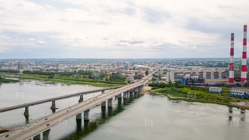 Кузнецкий мост через реку Томь. Панорамный вид на город Кемерово. Россия, Из Дрона