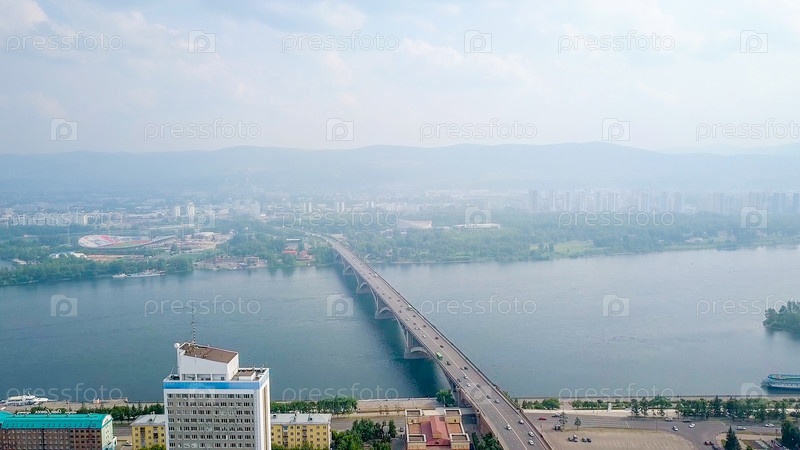 Городские часы. Коммунальный мост, администрация города. Панорама города Красноярска. Россия, Из Дрона