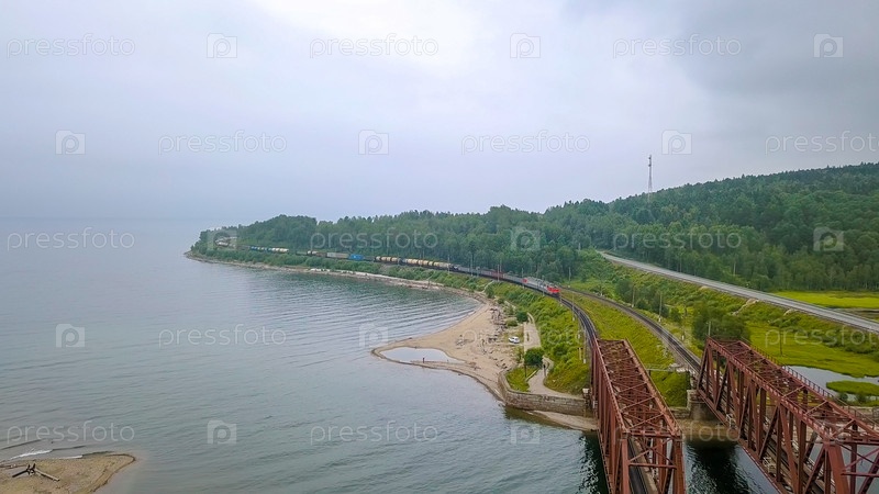 Транссибирская магистраль, побережье озера Байкал. Движение поездов по железному мосту через реку, впадающую в Байкал. Россия, с дрона