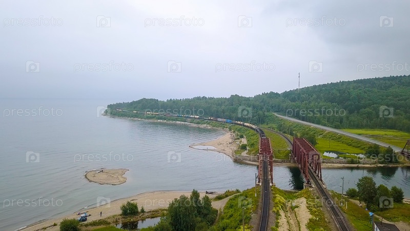 Транссибирская магистраль, побережье озера Байкал. Движение поездов по железному мосту через реку, впадающую в Байкал. Россия, с дрона