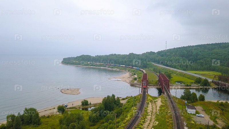 Транссибирская магистраль, побережье озера Байкал. Движение поездов по железному мосту через реку, впадающую в Байкал. Россия, с дрона