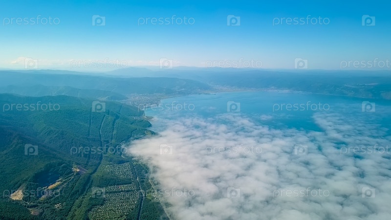 Полет над облаками. Побережье Байкала. Горы, покрытые лесом. Россия, с дрона