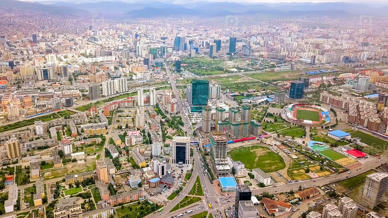 Монголия, Улан-Батор Панорама города с высоты птичьего полета в пасмурную погоду, с дрона