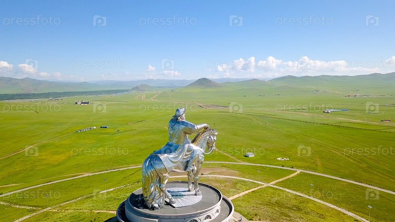 Конная статуя Чингисхана в солнечную погоду. Монголия, Улан-Батор, с дрона