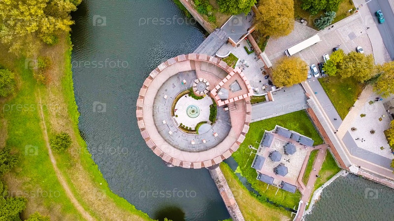 Крепостная башня середины девятнадцатого века.Расположен в центре Калининграда на берегу Верхнего озера, с дрона, HEAD OVER SHOT