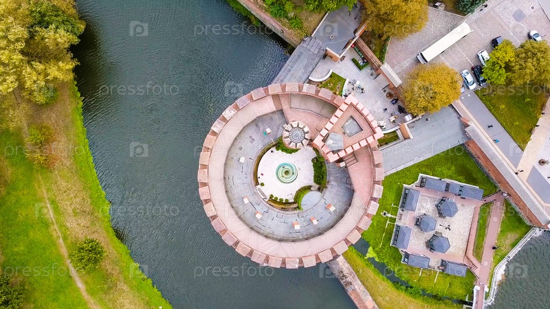 Крепостная башня середины девятнадцатого века.Расположен в центре Калининграда на берегу Верхнего озера, с дрона, HEAD OVER SHOT
