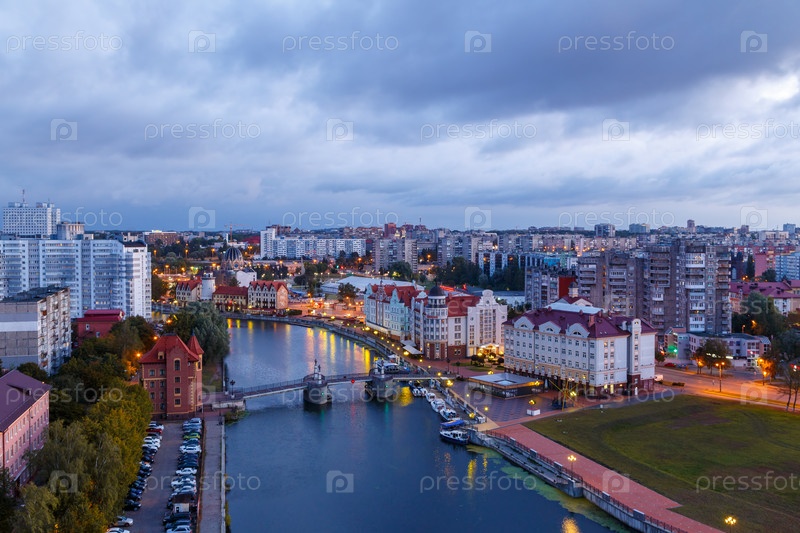 Утро. Центральная часть города Калининграда, набережная Рыбной деревни, Юбилейный мост. Калининград, Россия