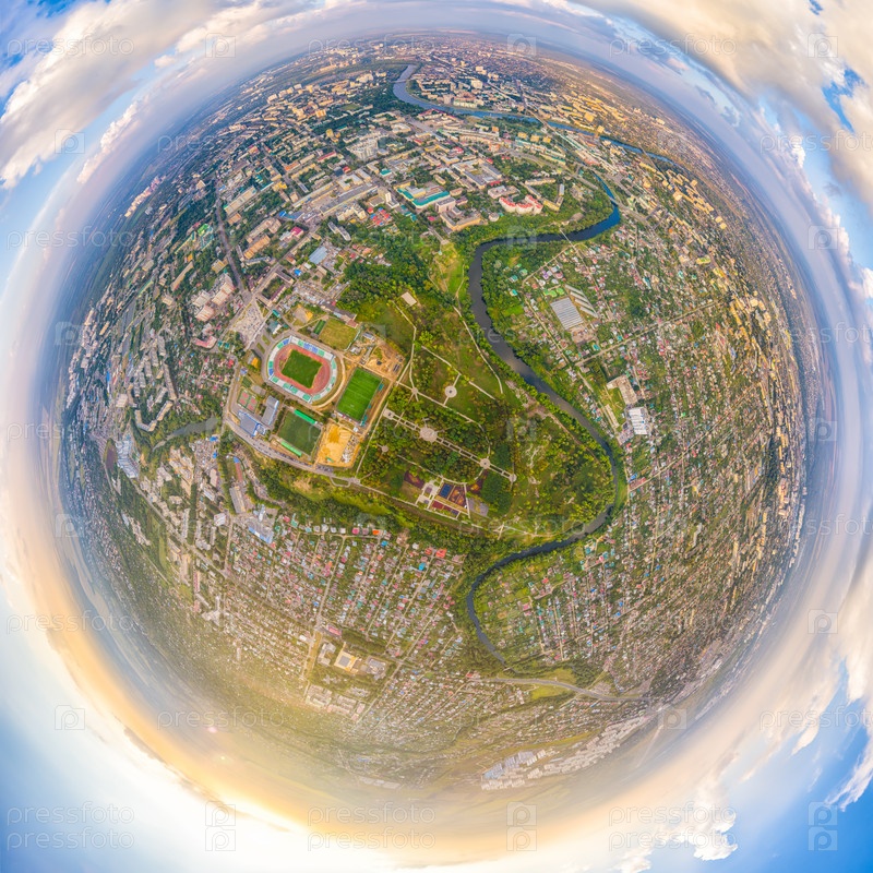 Орел, Россия. Панорама города во время заката Пасмурная погода. 360-градусный воздушный панорамный астероид