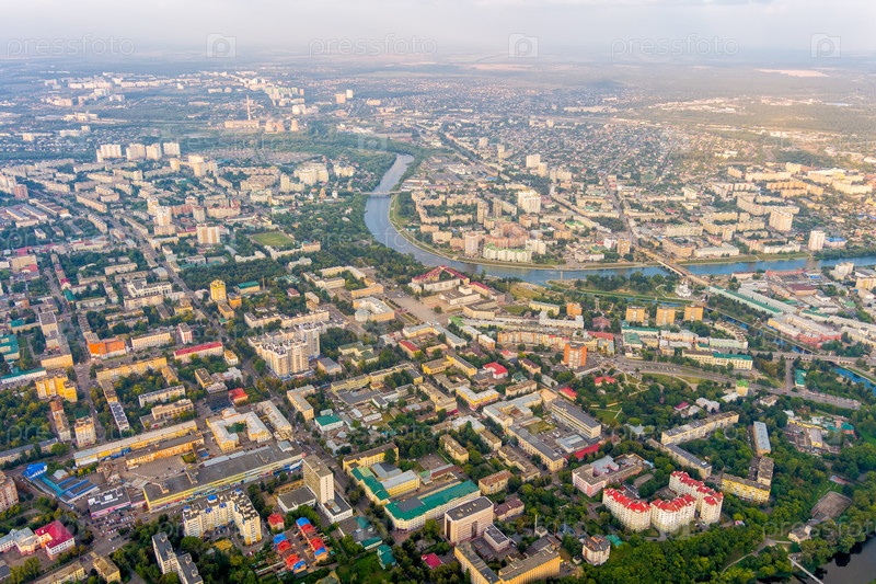 Орел, Россия. Панорама города во время заката Пасмурная погода. С высоты птичьего полета