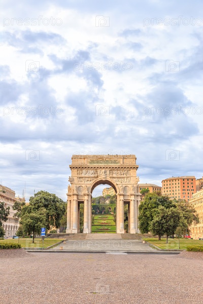 В Италии, Генуя. Арка Победы. Текст на английском языке: ГЕНУЯ. СИНОВИЯ, ПРОБЛЕЖНОСТЬ РОДОНЫ, ЗАГРАЗОВАТЕЛЬСТВА НА ЛЕСЕ И МОРЕ В ЦЕРКУ В Славе Веков. СПОРТА ОПИСАННАЯ. MCMXV-MCMXVIII