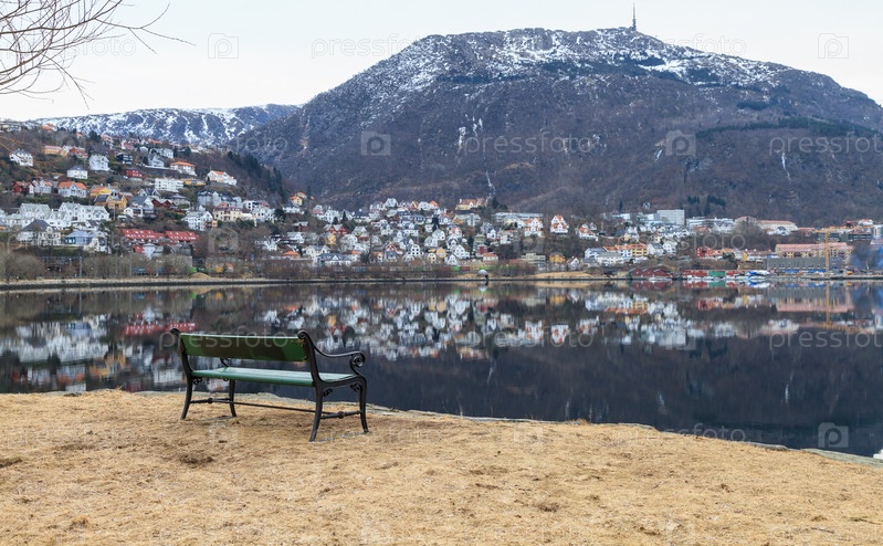 Скамейка на берегу Магазин Lungegardsvannet, Берген, Норвегия