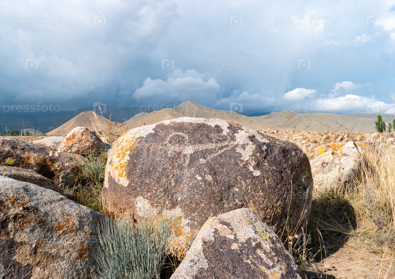Древние рисунки, петроглифы на скалах у Иссык-Куля, Чолпон-Ата, Кыргызстан