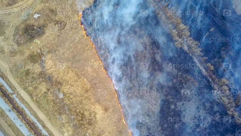 Большой пожар. Горит сухая трава. много дыма. Екатеринбург, Россия, Из Дрона