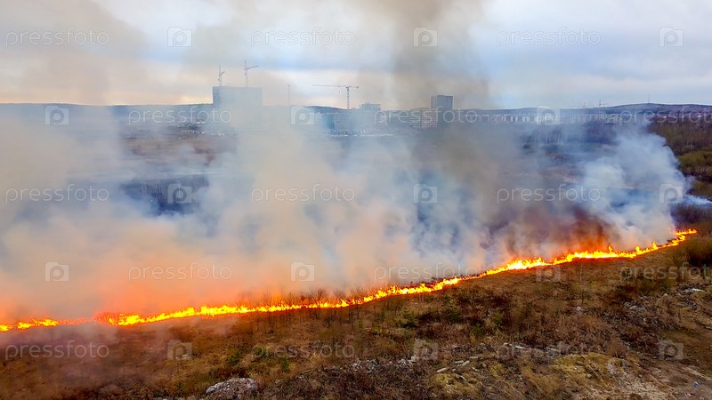 Большой пожар. Горит сухая трава. много дыма. Екатеринбург, Россия, Из Дрона
