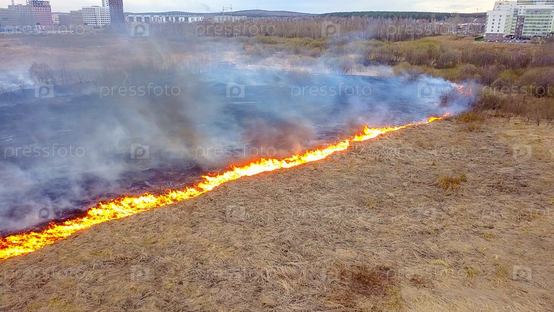 Большой пожар. Горит сухая трава. много дыма. Екатеринбург, Россия, Из Дрона