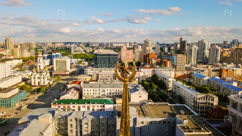 Кружение вокруг звезды, установленной на Мэрии и городе Екатеринбурге, Россия, От Дрона