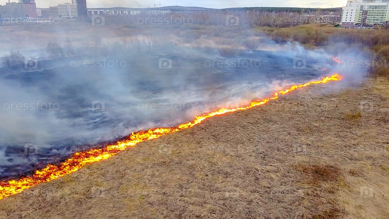 Большой пожар. Горит сухая трава. много дыма. Екатеринбург, Россия, Из Дрона