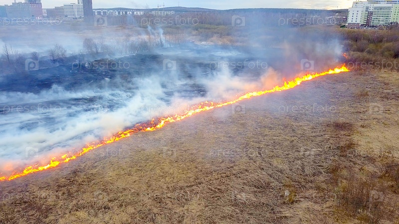 Большой пожар. Горит сухая трава. много дыма. Екатеринбург, Россия, Из Дрона