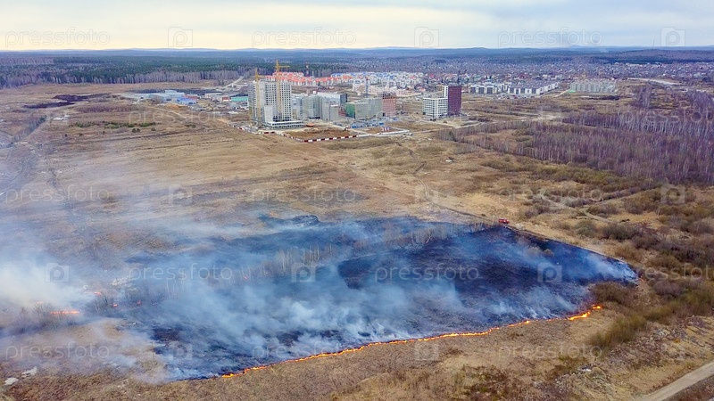 Большой пожар. Горит сухая трава. много дыма. Екатеринбург, Россия, Из Дрона