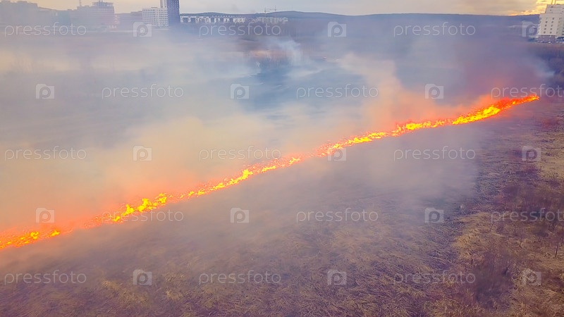 Большой пожар. Горит сухая трава. много дыма. Екатеринбург, Россия, Из Дрона