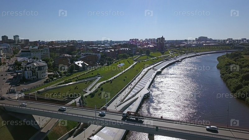 Город Тюмень, набережная реки Туры, автомобильный мост Челюскинцев.Россия, Текст на русском языке - 432 TYUMEN, From Dron