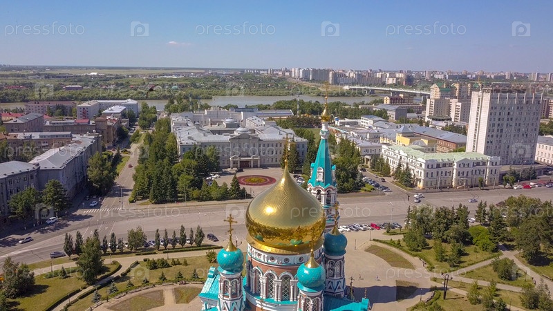 Собор Успения Пресвятой Богородицы, панорамный вид на город. Омск, Россия, Из Дрона