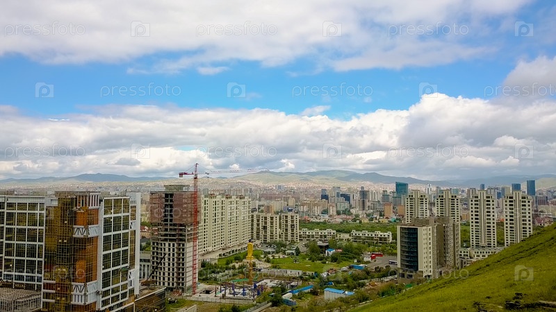 Монголия, Улан-Батор Панорама города с высоты птичьего полета в пасмурную погоду. Посадка, С дрона