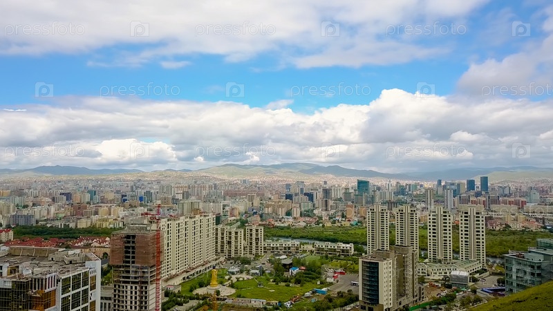 Монголия, Улан-Батор Панорама города с высоты птичьего полета в пасмурную погоду. Посадка, С дрона
