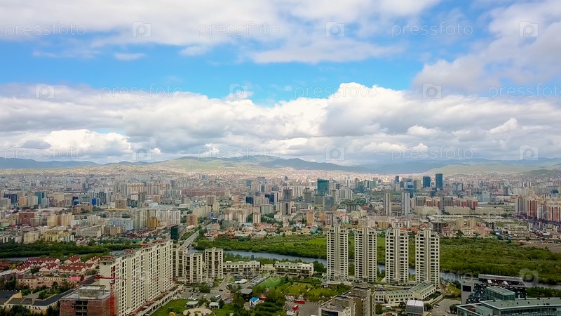 Монголия, Улан-Батор Панорама города с высоты птичьего полета в пасмурную погоду. Посадка, С дрона