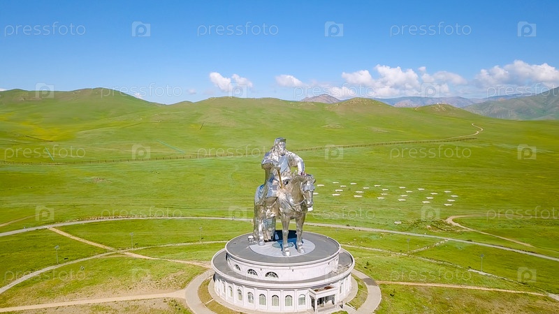 Конная статуя Чингисхана в солнечную погоду. Монголия, Улан-Батор, с дрона