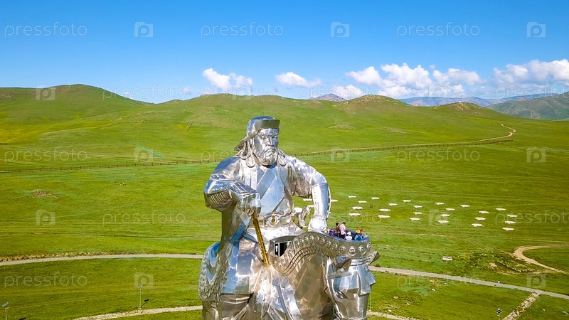 Конная статуя Чингисхана в солнечную погоду. Монголия, Улан-Батор, с дрона