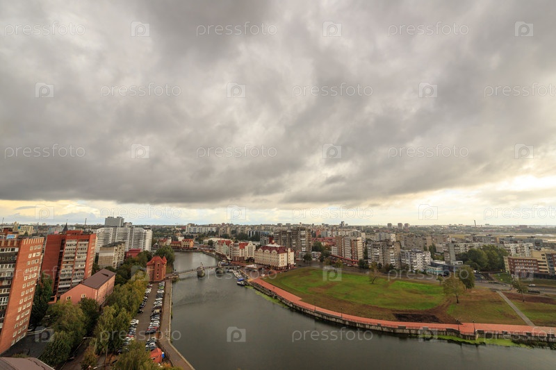Дождь над городом. Центральная часть города Калининград, Россия