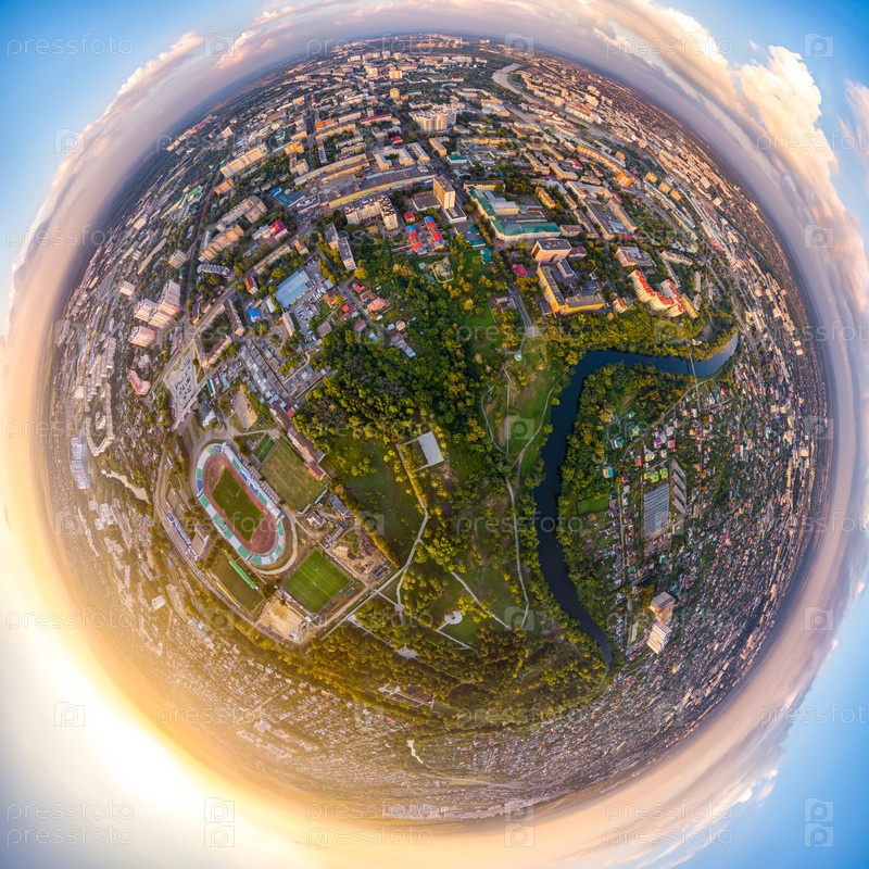 Орел, Россия. Панорама города во время заката Пасмурная погода. 360-градусный воздушный панорамный астероид