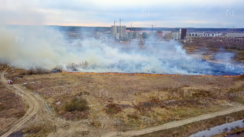 Большой пожар. Горит сухая трава. много дыма. Екатеринбург, Россия, Из Дрона