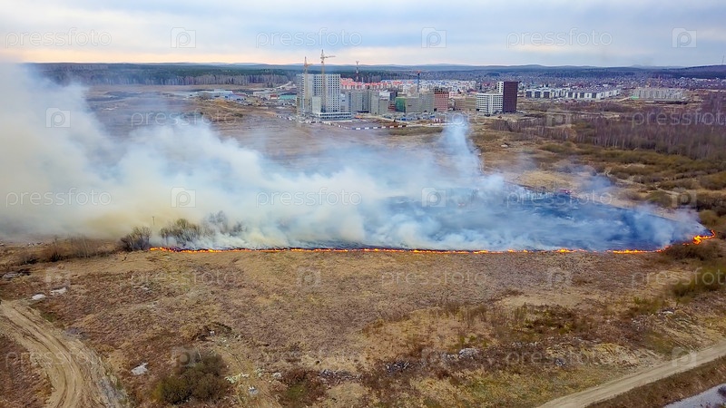 Большой пожар. Горит сухая трава. много дыма. Екатеринбург, Россия, Из Дрона
