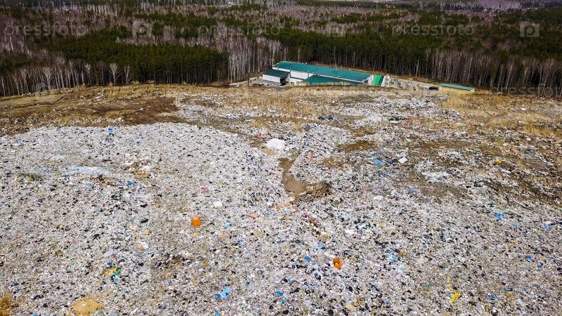 Мусорная свалка в черте города. Вид на город Екатеринбург, Россия, с дрона
