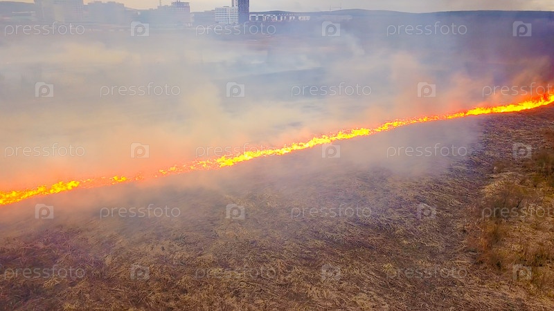 Большой пожар. Горит сухая трава. много дыма. Екатеринбург, Россия, Из Дрона