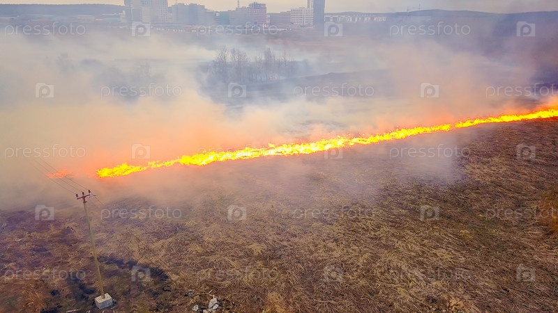 Большой пожар. Горит сухая трава. много дыма. Екатеринбург, Россия, Из Дрона