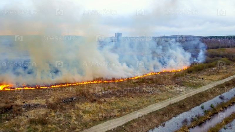 Большой пожар. Горит сухая трава. много дыма. Екатеринбург, Россия, Из Дрона