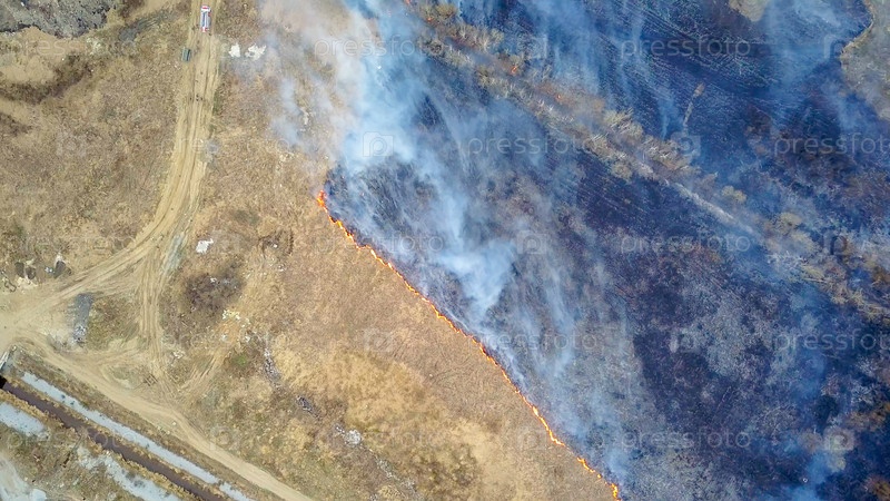 Большой пожар. Горит сухая трава. много дыма. Екатеринбург, Россия, Из Дрона
