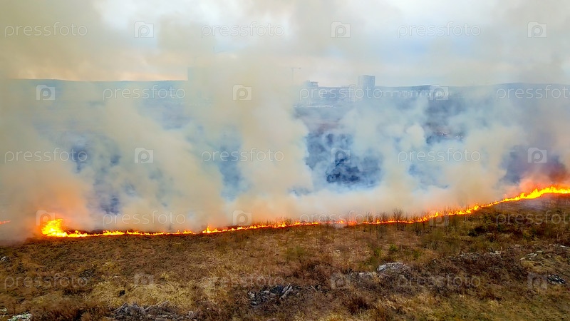 Большой пожар. Горит сухая трава. много дыма. Екатеринбург, Россия, Из Дрона
